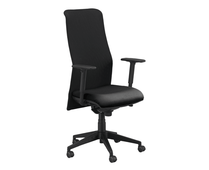 Black nylon legs, soft castors. Black mesh backrest made from 100% polyester 220 g/m2, resistant to wear and fire-resistant (EN 1021-1 (cigarettes) and EN 1021-2 (matches)). Pockets on the back of the backrest. Height-adjustable polyurethane armrests. Seat with plastic shell, upholstered with orange, sky blue, raspberry, anise green or black flame-retardant X-Treme fabric. Polyether seat foam, 50 mm thick, density 43 kg/m3. Seat size: W.45 x H.42-55 x D.44 cm.