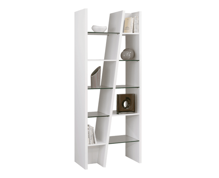 6 glass shelves (thickness 10mm) Particleboard frame with white hydro lacquer, flat edges with white hydro lacquer.