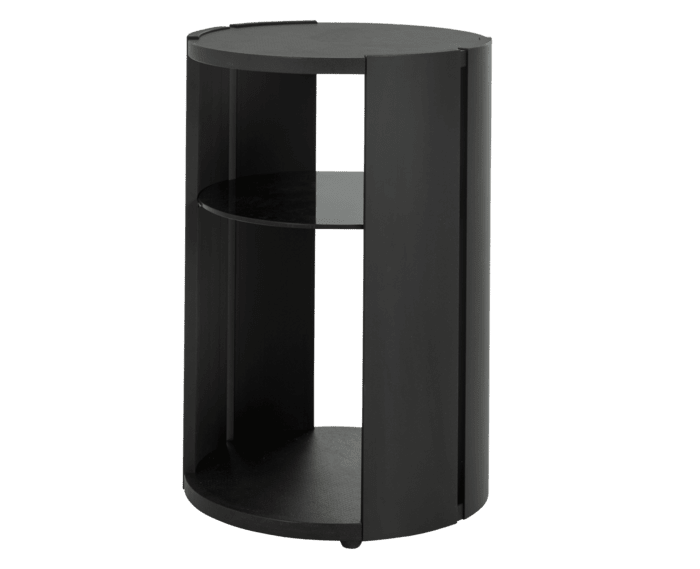 Shelf and underside made from particleboard covered with black melamine. Uprights made from MDF covered with black foil. Grey tempered glass top. The 2 upper shelves are interchangeable.