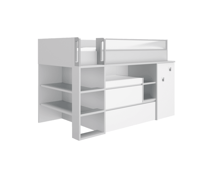 Frame and fronts in particleboard covered with plain white foil, smooth grey melamine or structured oak melamine. 2mm or 1mm thick ABS edges in grey and white or structured oak. Drawer frames made from particleboard covered with white PP (polypropylene) on white roller runners. Grey lacquered zamak handles. Grey lacquered metal desk legs and aluminium runners. ABS non-slip edges, clip-on hinges. Guard rails on high beds, bunk beds and partition door in PMMA with a grey aluminium frame. Grey lacquered beech ladder handles and headboard. All furniture is self-assembly except where marked * (fully assembled with possible exception of handles, floor protectors and castors). Reversible assembly. On the front: 1 perforated base panel for 90 x 200 cm mattress, 1 ladder; 1 retractable desktop, width 76.5 x depth 60 x height 71.5 cm, with 1 charger and 2 USB ports; 1 drawer under the desktop and 2 storage compartments at the side; 1 large storage drawer; 1 door with 1 hanging rail and 1 shelf (can be positioned at the back, middle or front with a choice of 3 heights). Side: 2 large shelves. For ref. 1A0660A and 1A2660A: 1 LED lighting strip with dimmer and switch built into the grey aluminium frame of the PMMA guard rail. In accordance with current regulations, this item meets the safety requirements set out in European standard NF EN 747 for high beds. High beds are not suitable for children under 6 years of age. Item for home use only.